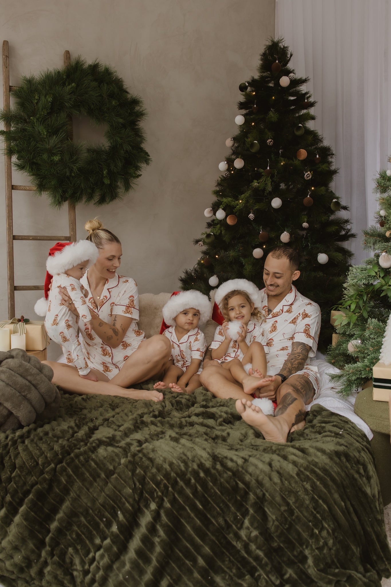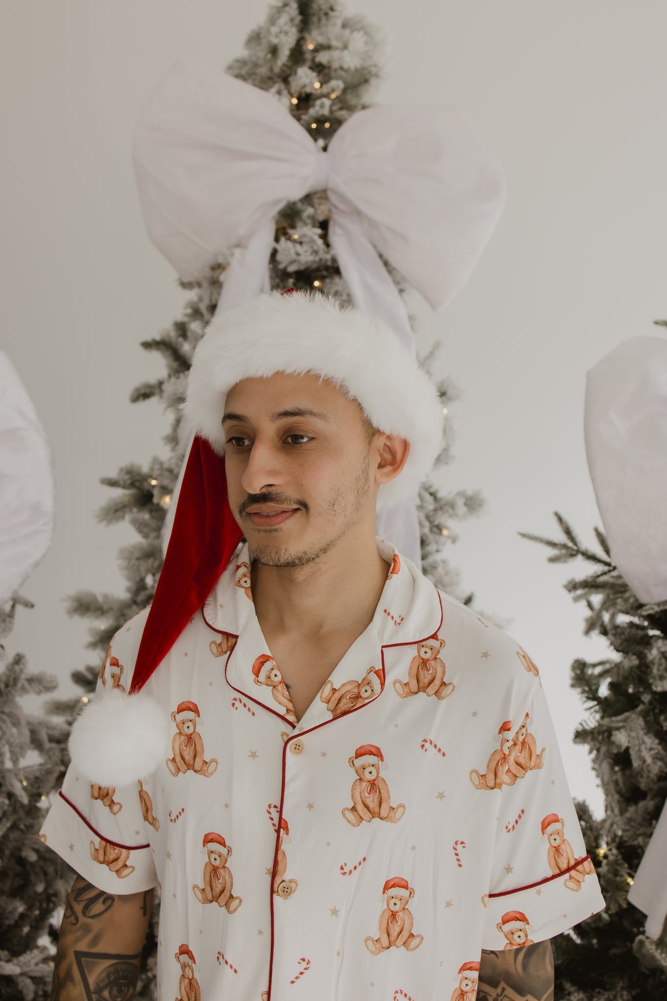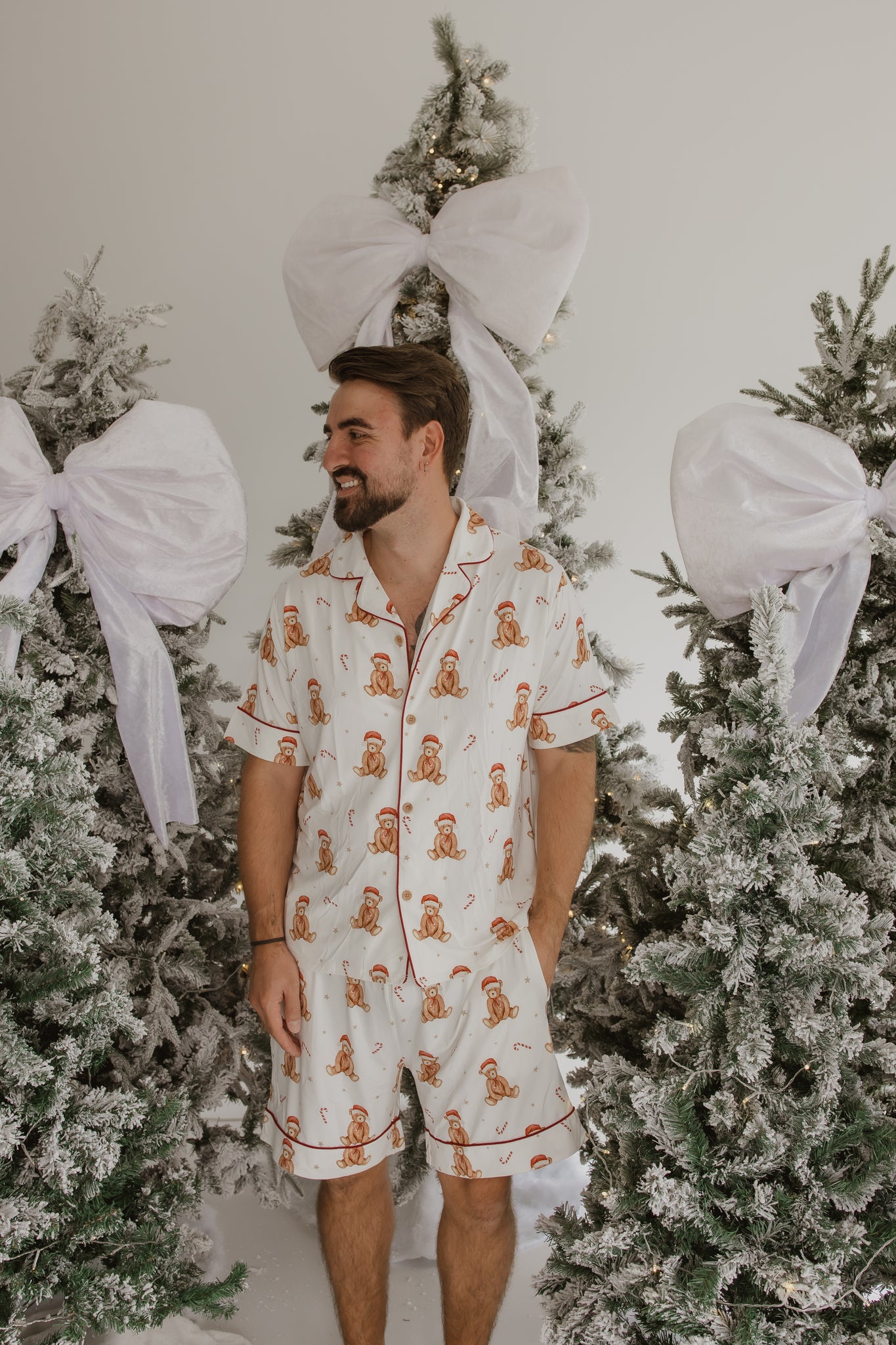 Our Christmas PJs are the perfect festive outfit this season. With an adorable teddy bear & candy cane print, buttons down the front, and a drawstring at the waist, it is lightweight and breathable ensuring maximum comfort. A must-have wardrobe staple this season!