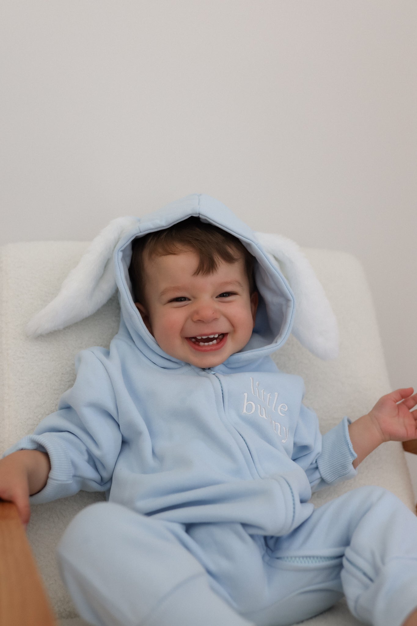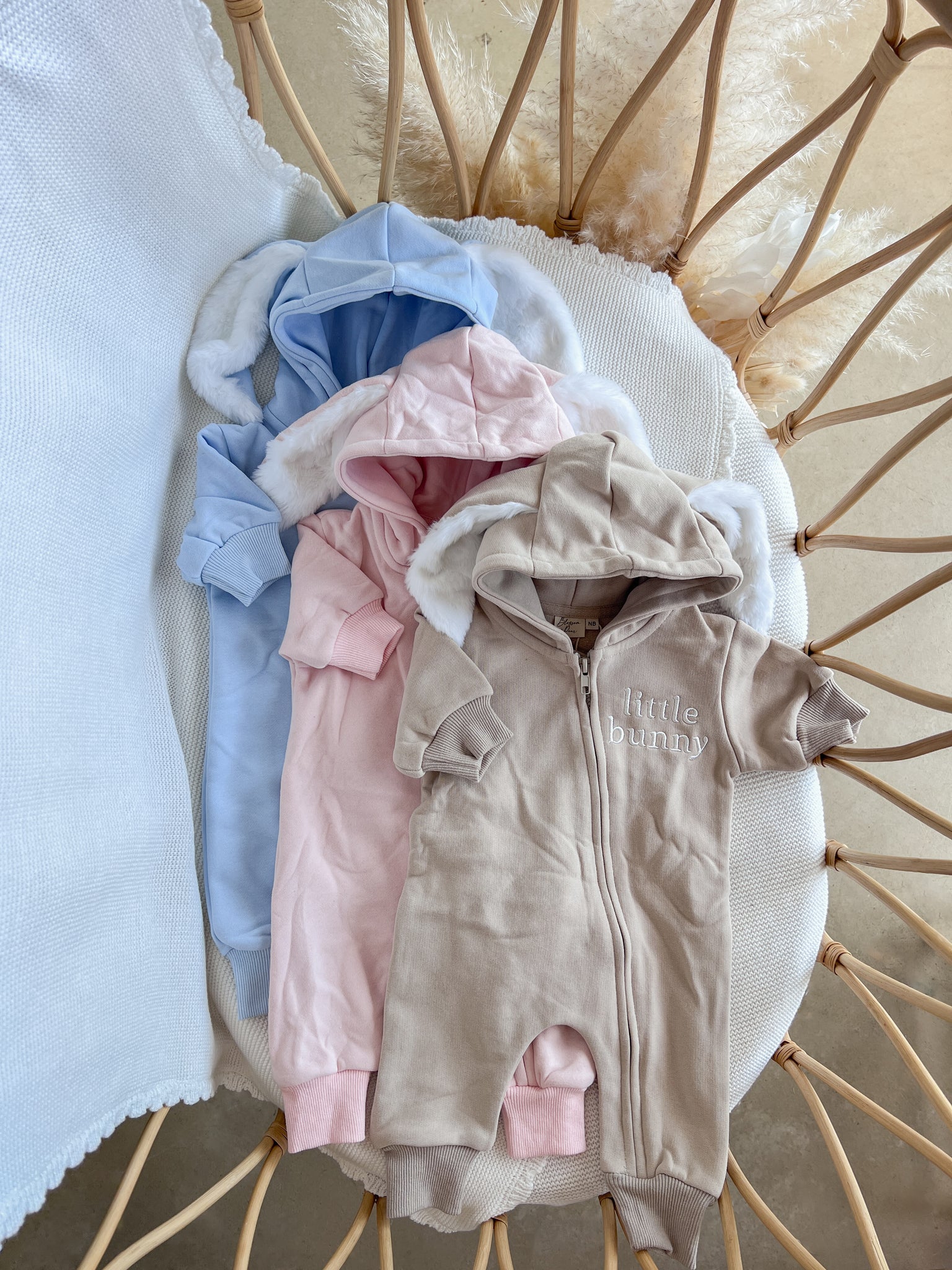 Comfort meets style with our embroidered 'Little Bunny' Zip Romper. Made from thick, luxuriously soft fleece lined cotton fabric, it is the perfect gender neutral piece for your little love. Featuring a zipper for easy changing, plush ears, a removable bunny tail and embroidered 'little bunny' on the chest.