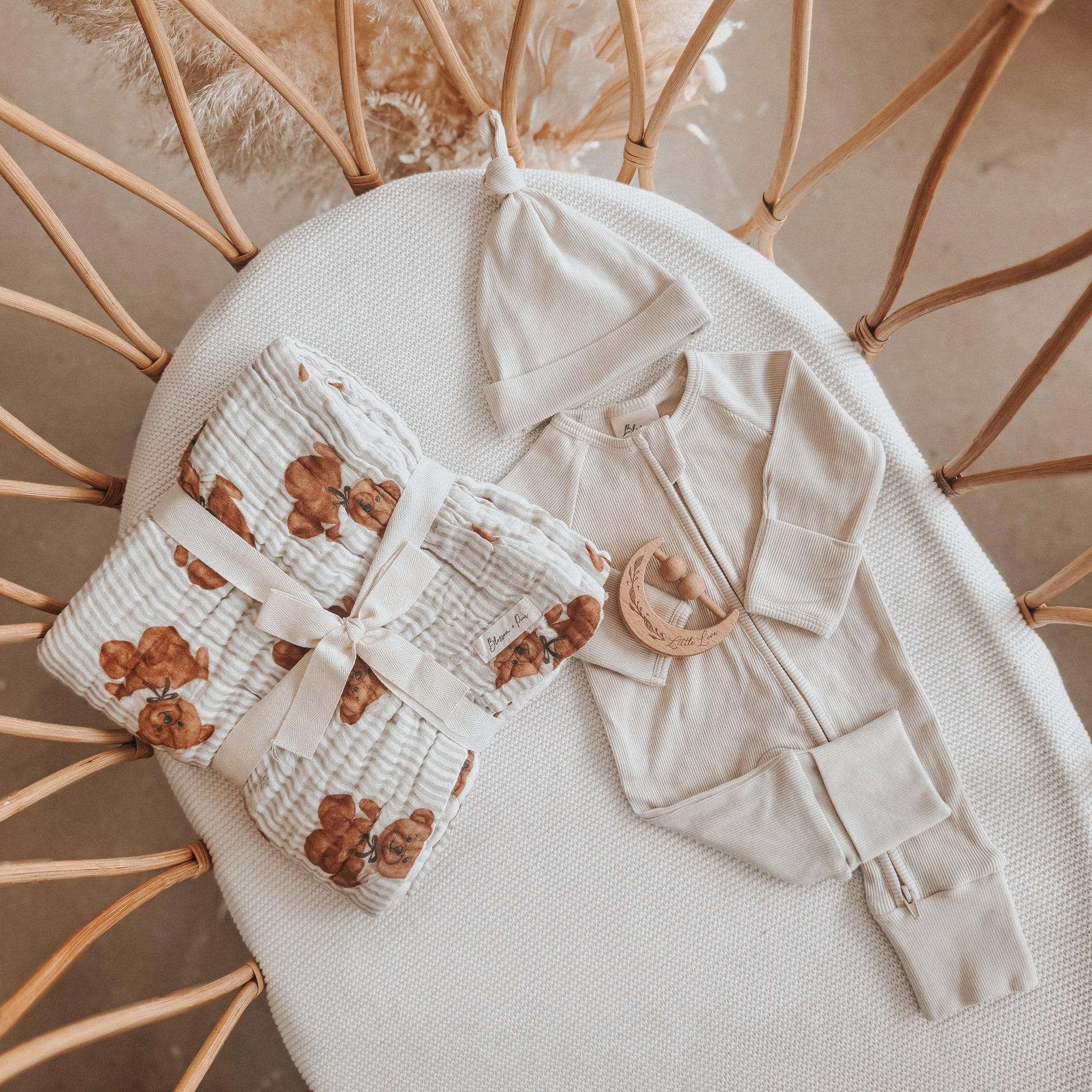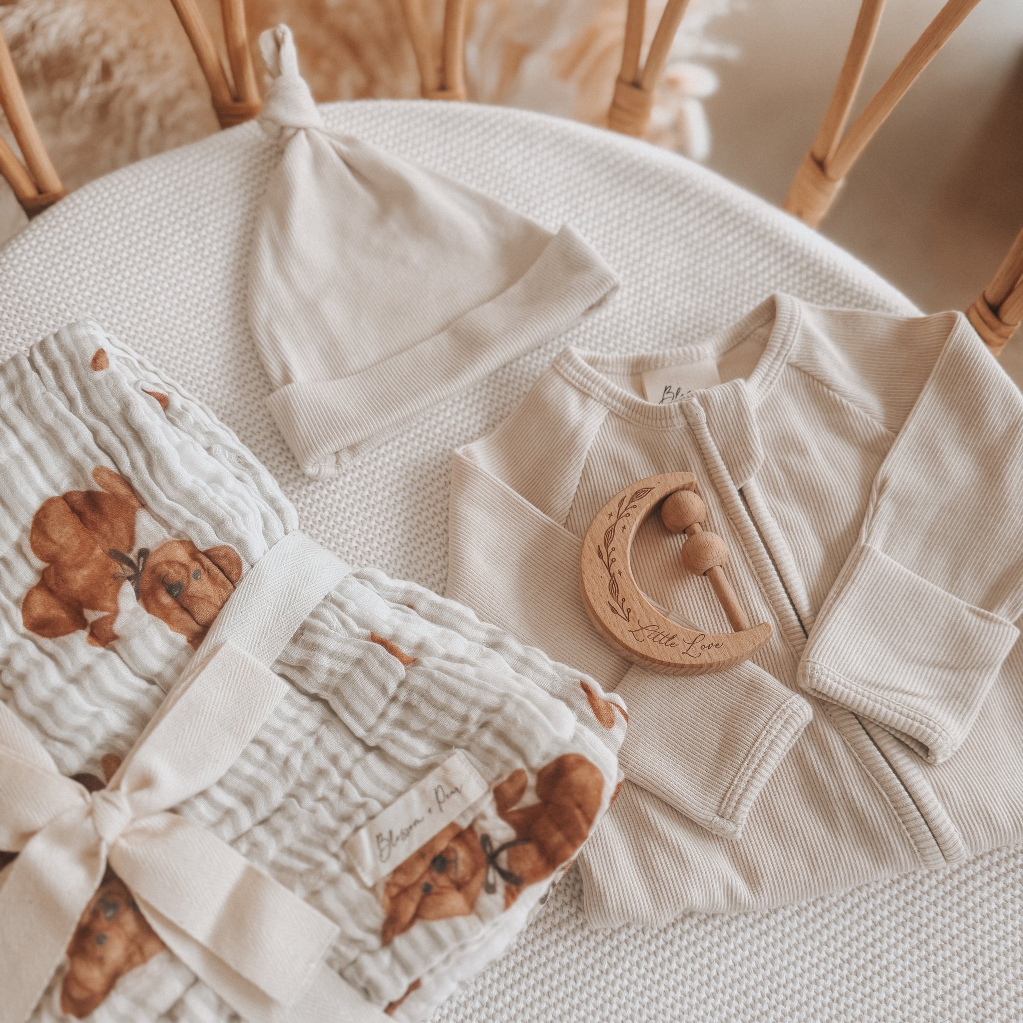Perfect for newborn announcements, hospital bags, or baby shower gifting, this bundle brings together comfort, practicality, and timeless design - all in one beautifully coordinated set.