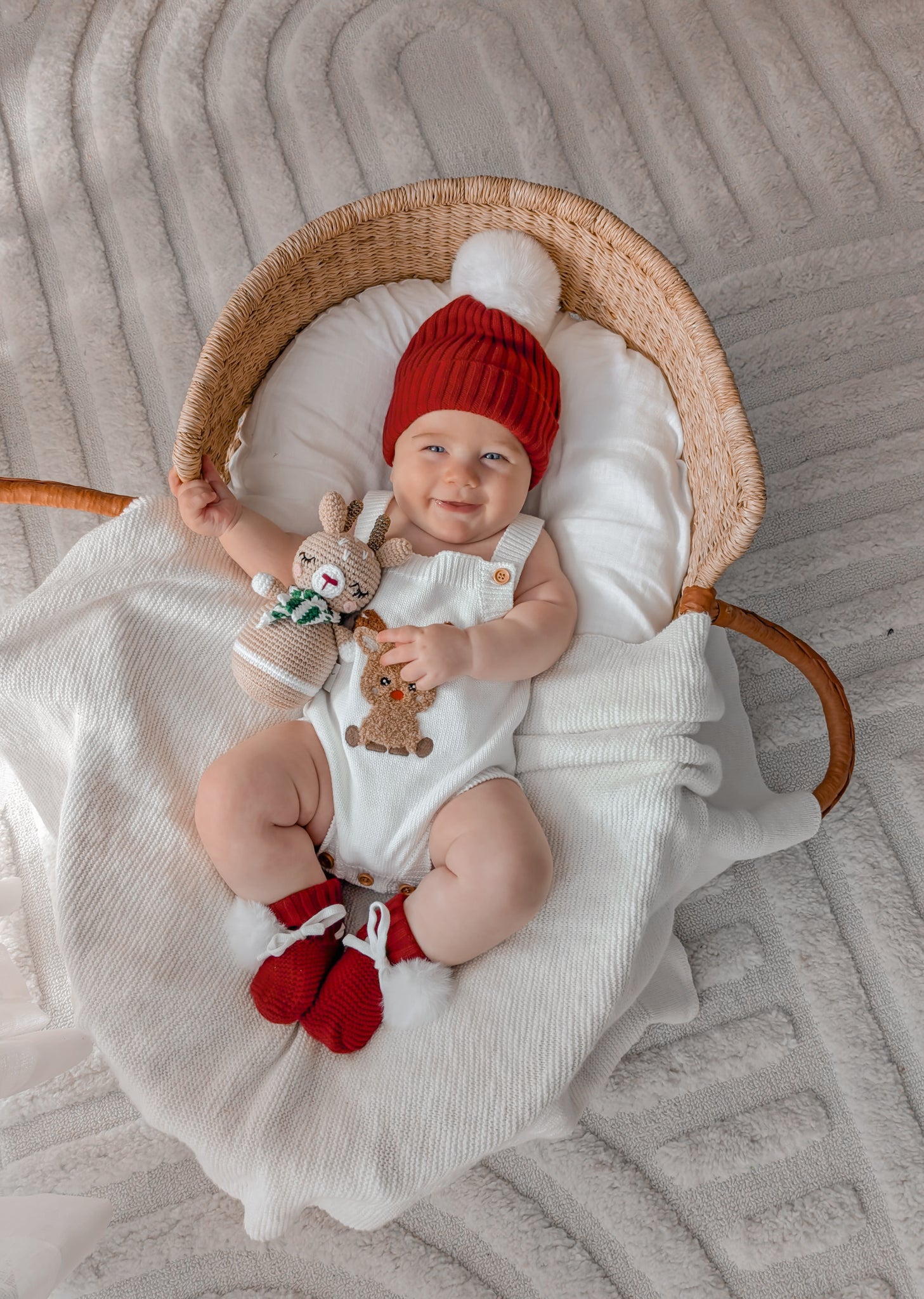 Our beautiful cosy Reindeer Singlet Mini Knit Romper is the perfect piece for your mini this festive season. Made with a beautiful soft white cotton reindeer detail, this romper features wooden buttons on the straps for 2 adjustable lengths.