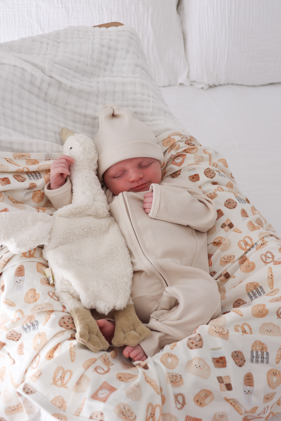 Our Newborn Knotted Beanie is made from 95% cotton and 5% spandex, and designed to match our Growsuit Collection.