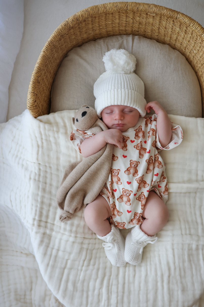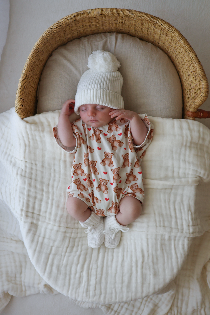 Introducing our Teddy Bear Heart T-Shirt Romper as part of our Valentine's Day Collection! This short sleeve romper is a perfect playful essential. Made for a comfy boxy fit available in sizes NB-2Y.