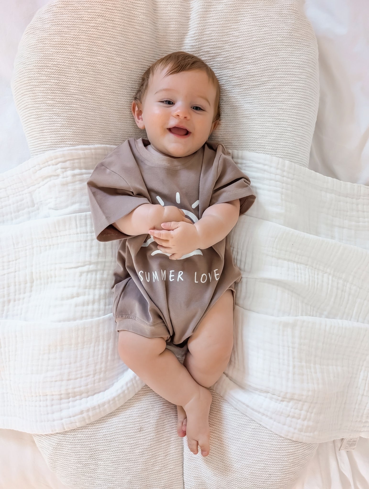 Introducing our Chocolate Slouch Romper as part of our Summer Collection! This short sleeve romper is a perfect playful summer essential. Made for a comfy boxy fit available in sizes NB-2Y.