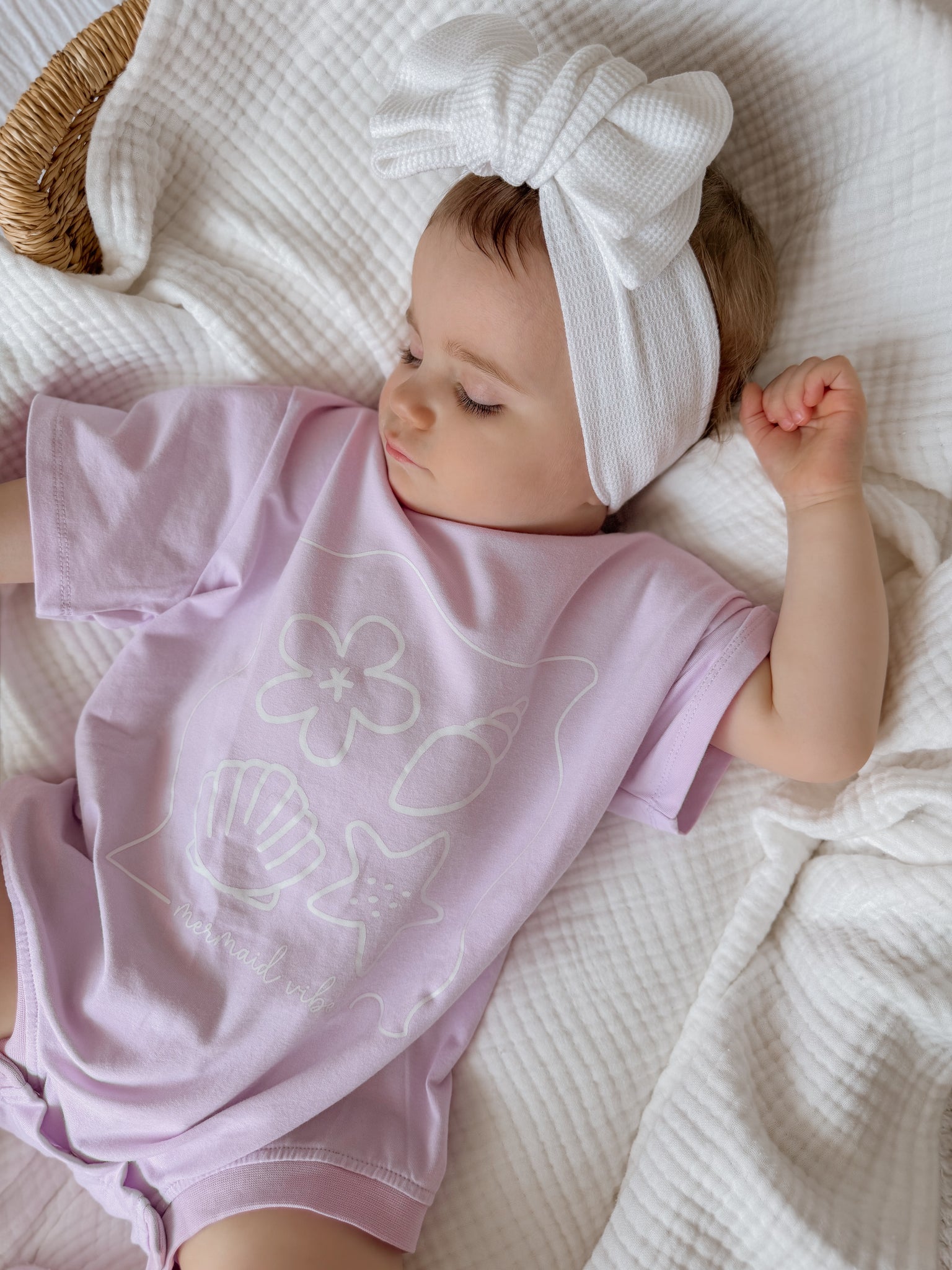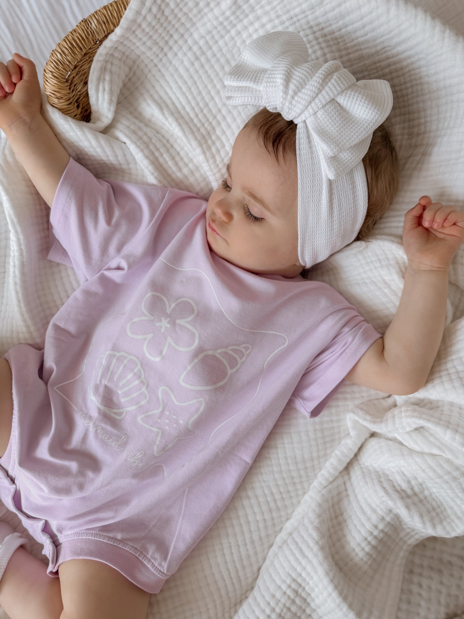 Introducing our Lavender Slouch Romper as part of our Sorbet Summer Collection! This short sleeve romper is a perfect playful summer essential. Made for a comfy boxy fit available in sizes NB-2Y.