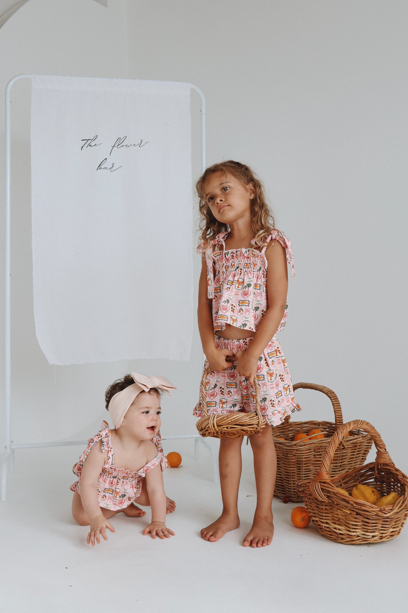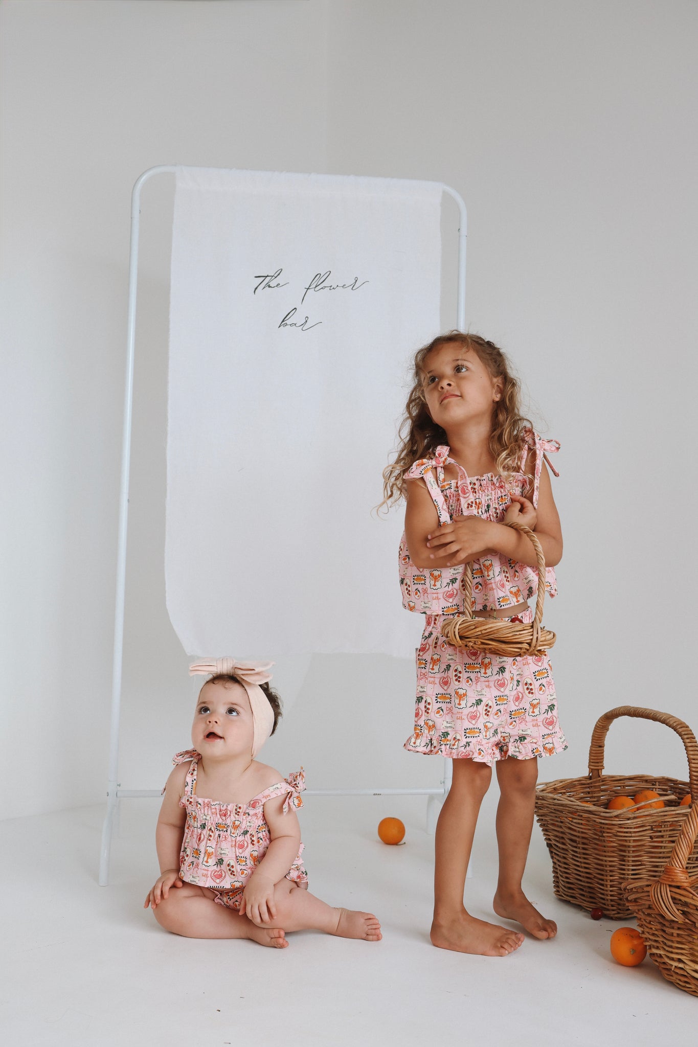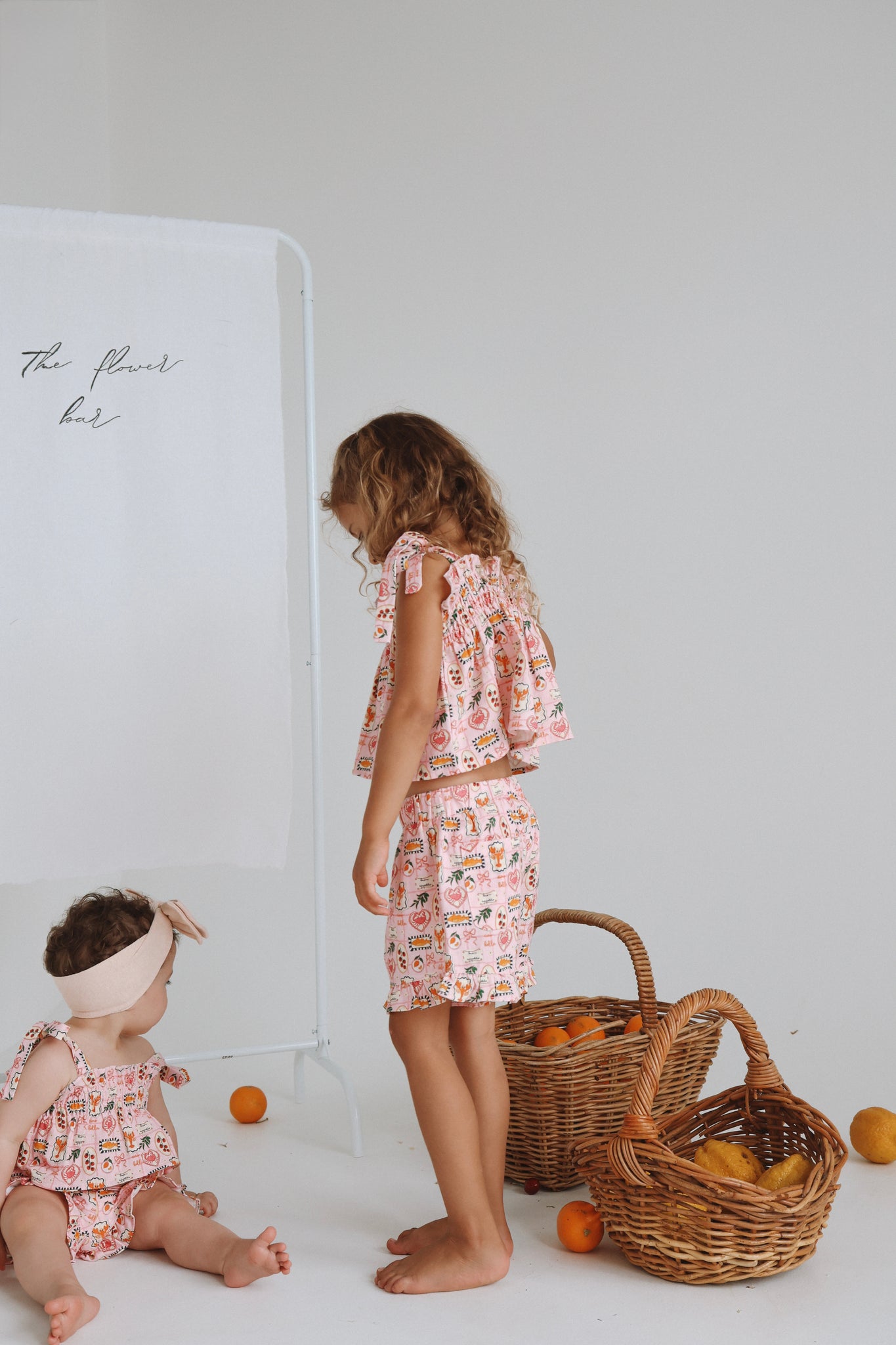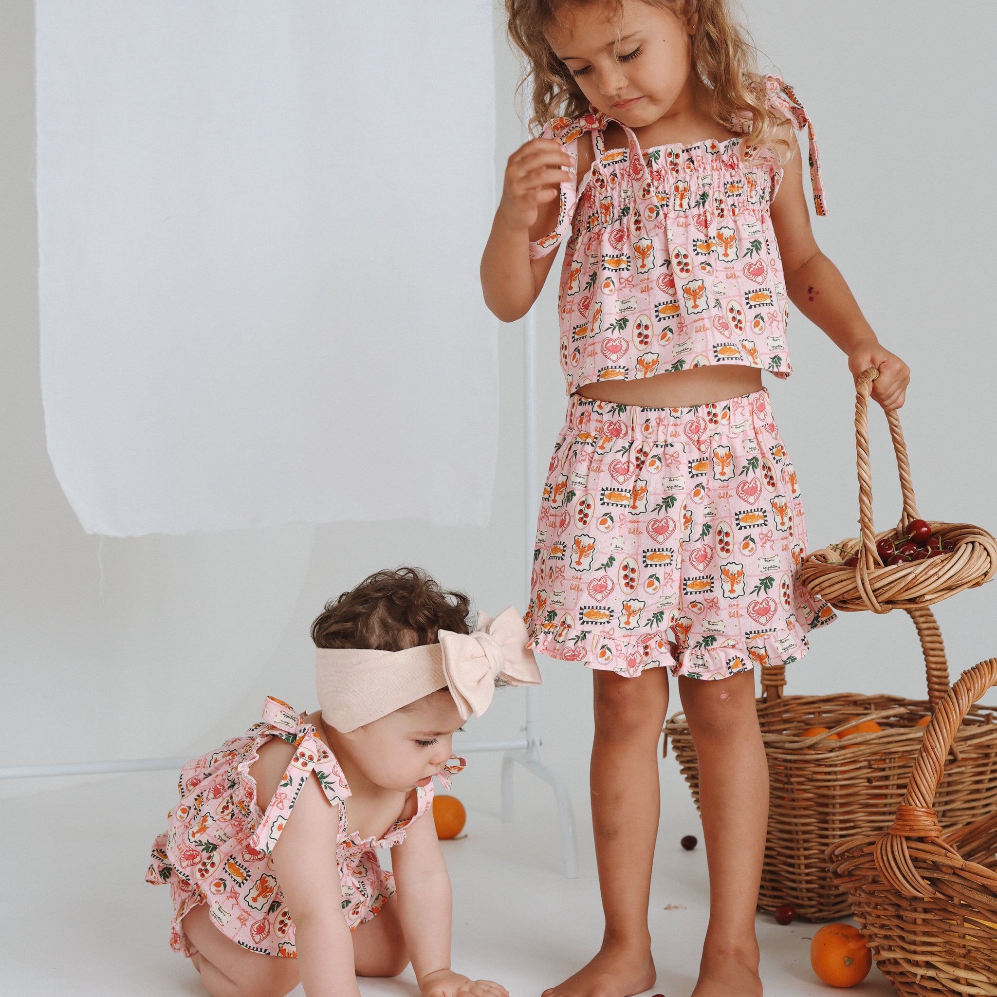 This is the perfect outfit for your little love. With an adorable pink print and beautiful ties on the shoulders, it is lightweight and breathable ensuring maximum comfort. A must-have wardrobe staple this season!