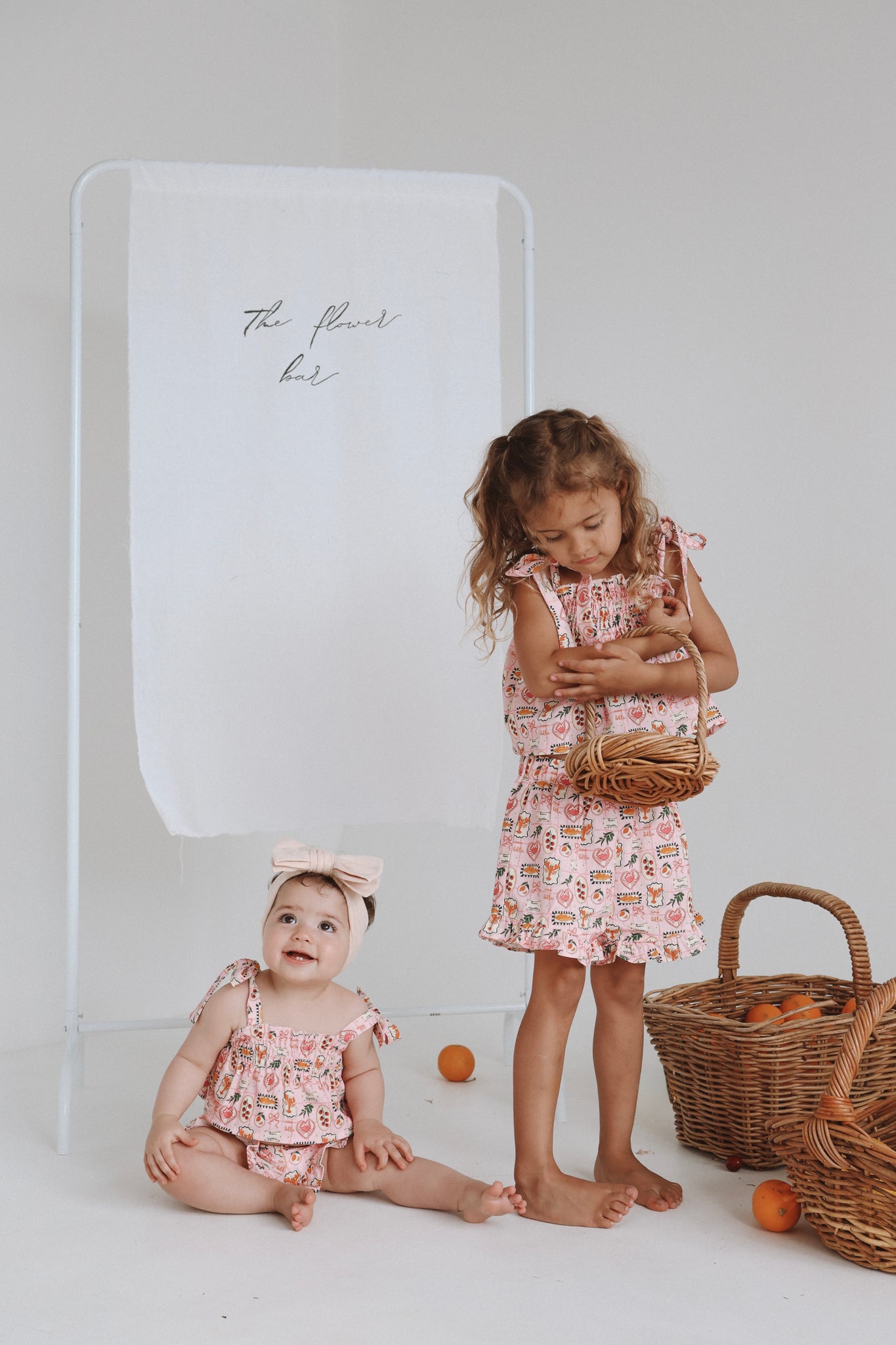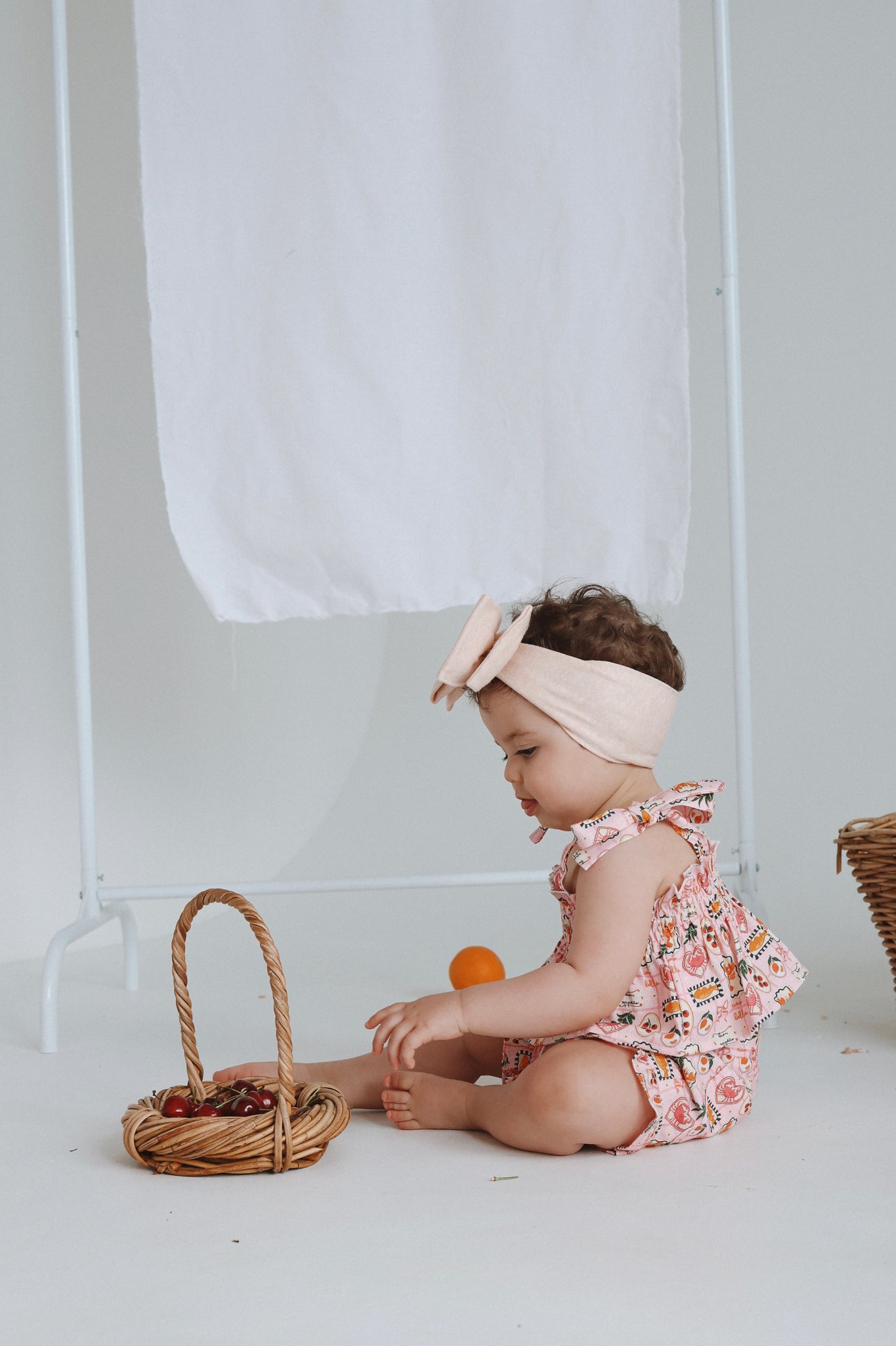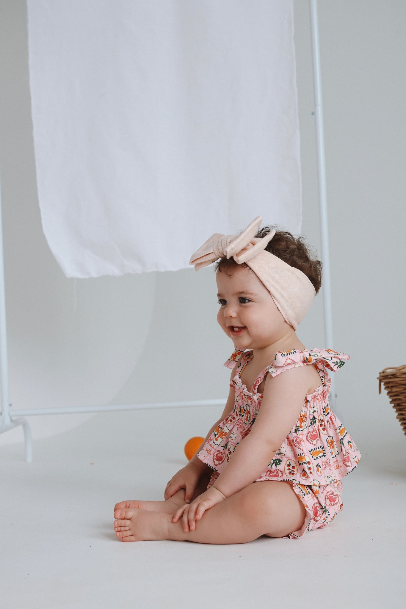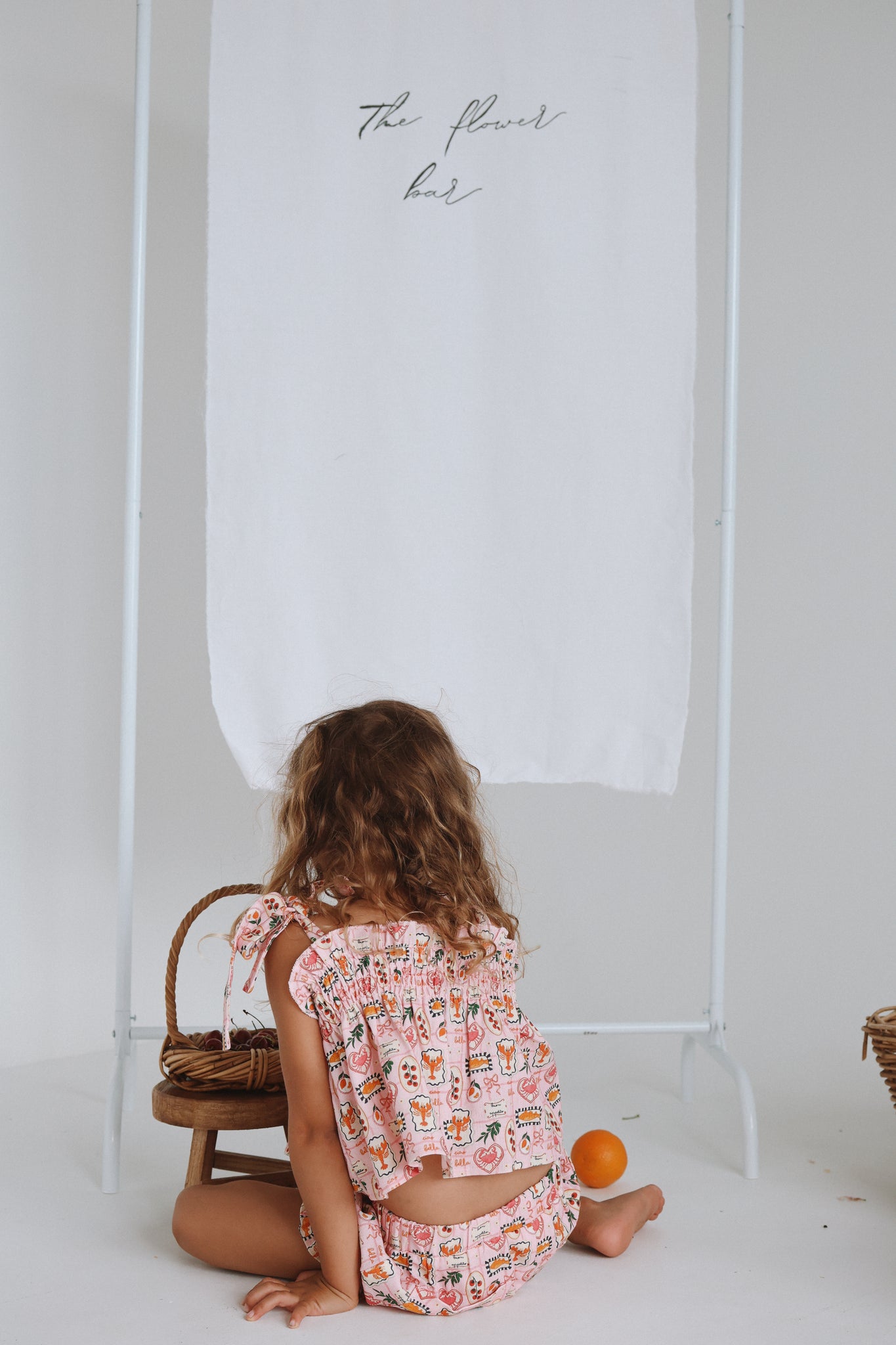 This is the perfect outfit for your little love. With an adorable pink print and beautiful ties on the shoulders, it is lightweight and breathable ensuring maximum comfort. A must-have wardrobe staple this season!