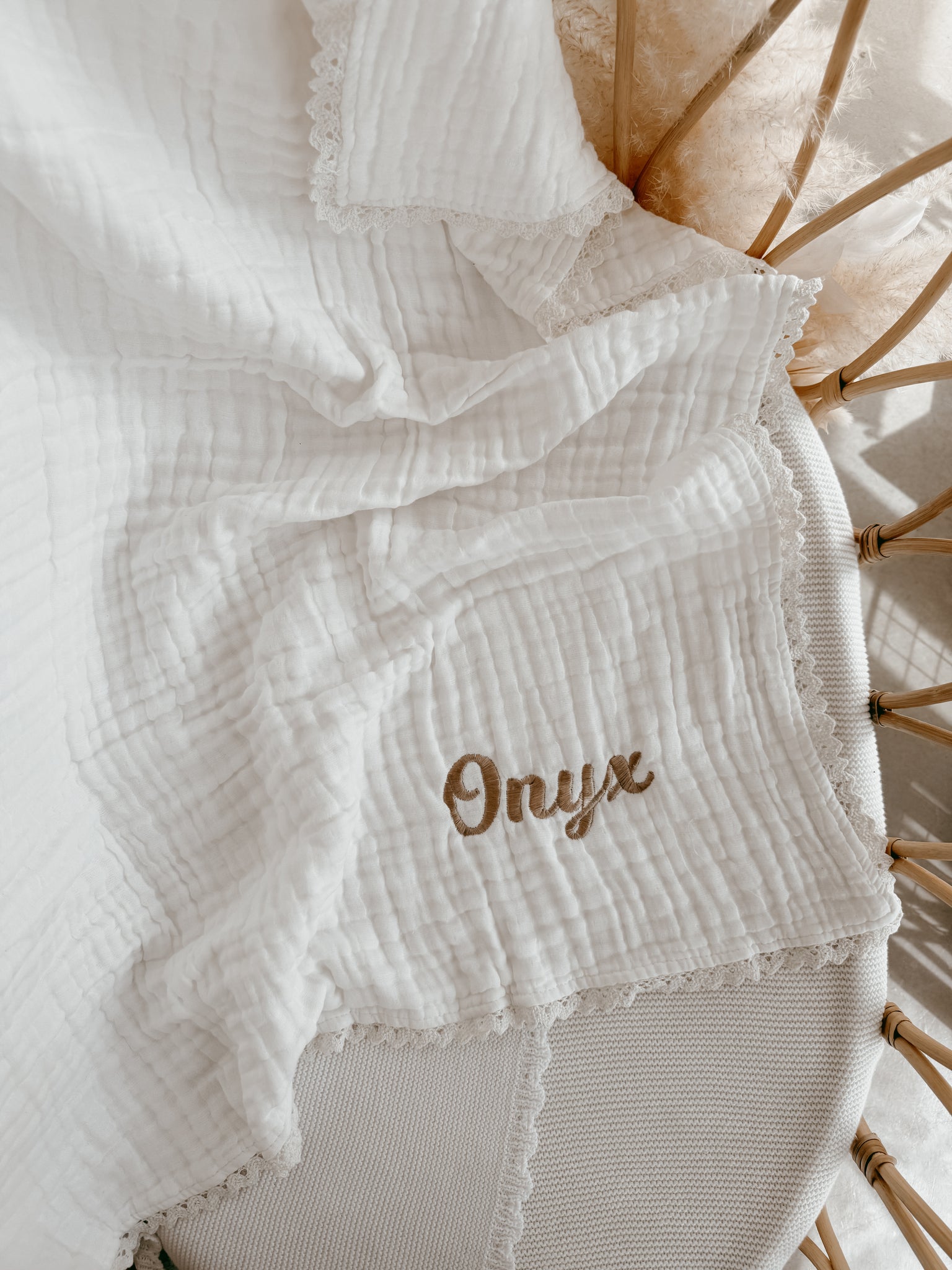 Keep your little love cosy and warm in our beautiful, soft 100% cotton Luxury Muslin Swaddle. Measuring approx. 120x120cm in size with a beautiful scallop lace edging, it is perfect for use in a pram, bassinet, cot, and to swaddle in the cooler months.