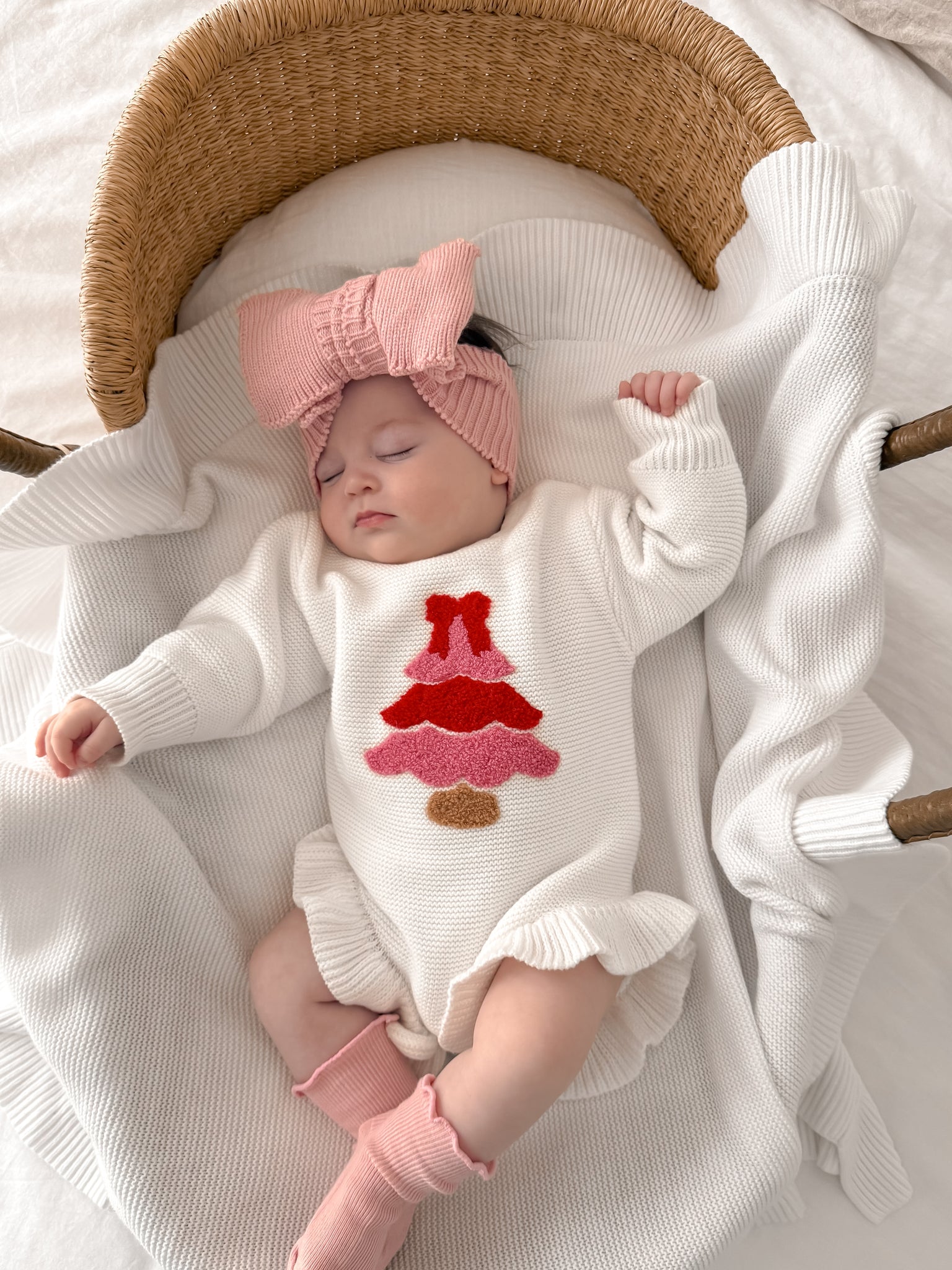 Our beautiful cosy Knit Romper is the perfect piece for your mini this festive season.  Made with a beautiful soft pink Christmas Tree detail, this romper features snaps for easy changing.