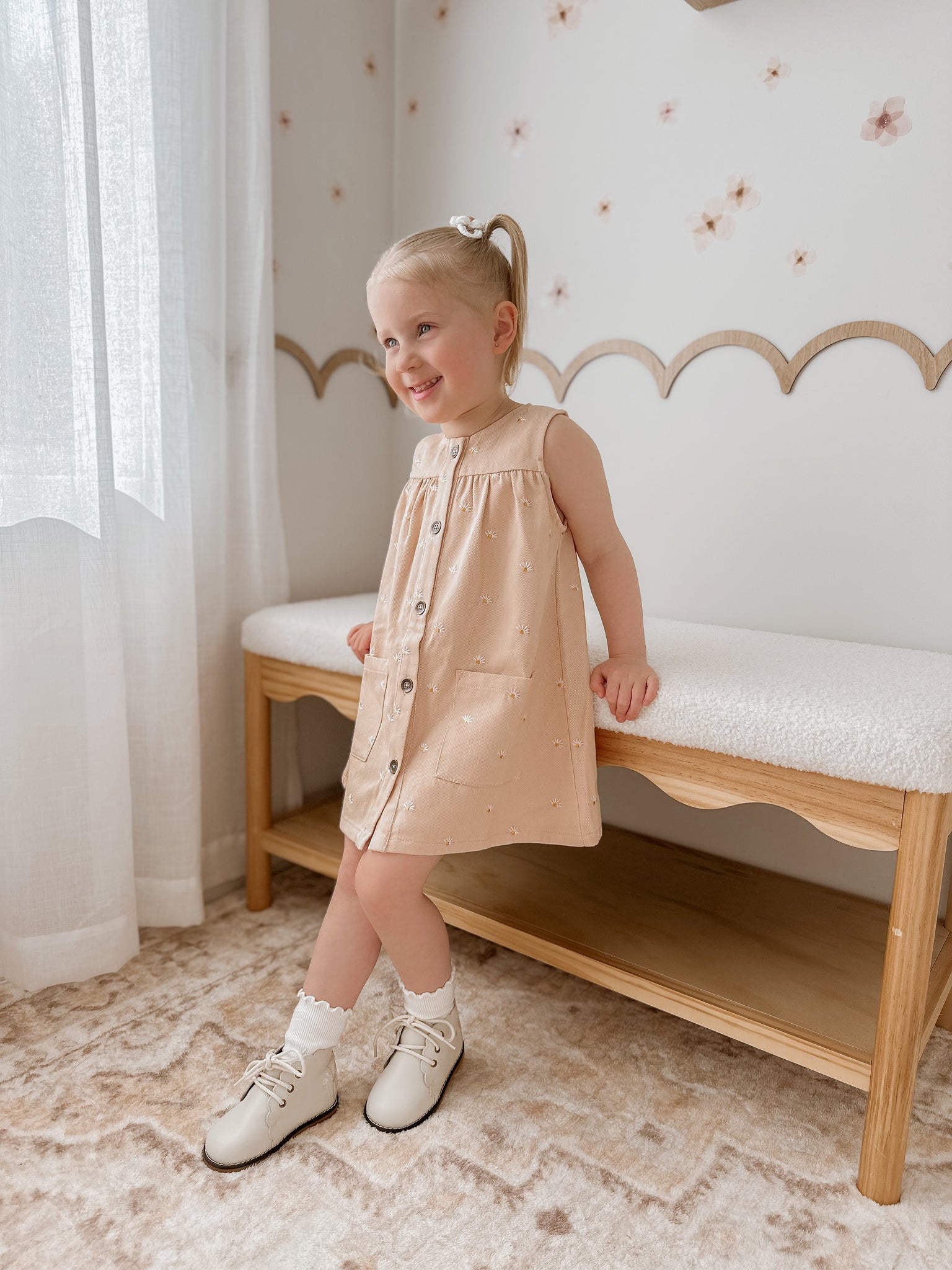 Our Denim Pinafore Dress offers an effortlessly cool look with it's classic denim fabric and embroidered detail. Durable and comfortable, this timeless piece can be dressed up or down for any occasion.